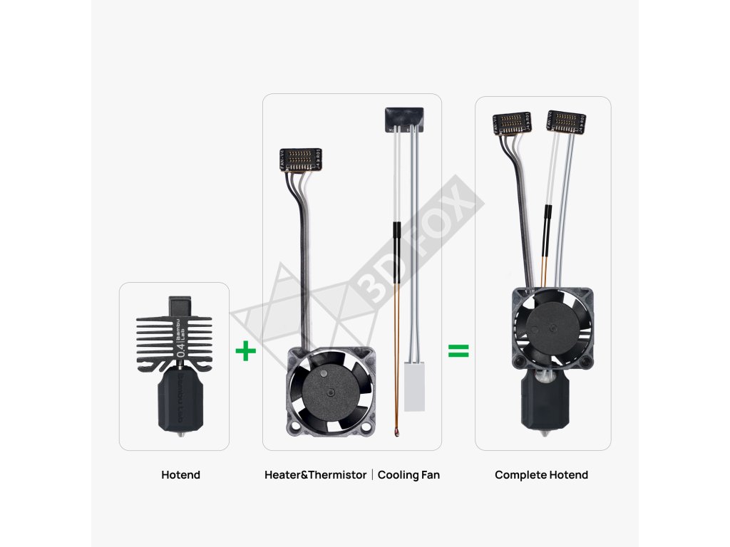 Bambu Lab ponúka hotendy v dvoch konfiguráciách: iba hotend s tryskou a kompletnú zostavu hotendu. Kompletná zostava hotendu obsahuje: [1] hotend s tryskou, [2] chladiaci ventilátor, [3] keramický vykurovací článok a termistor, [4] silikónovú ponožku. Dodáva sa vopred zostavený a pripravený na použitie vo vašej 3D tlačiarni Bambu Lab. Pokiaľ potrebujete vymeniť trysku, môžete buď vymeniť hotend za trysku na pôvodnej kompletnej zostave hotendu, alebo vymeniť celú zostavu hotendu.