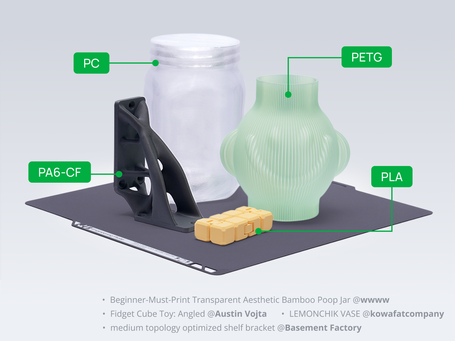 Jedna podložka pre všetky vlákna Bambu Engineering Plate je navrhnutá ako univerzálne riešenie pre vaše tlačové potreby. S jednoduchou vrstvou lepidla je kompatibilný s celým radom materiálov, od bežných ako PLA, TPU a PETG, až po materiály vyžadujúce vysoké teploty a odolnosť, ako sú ABS, ASA, PC, PA a filamenty s uhlíkovými vláknami (CF). Je to perfektná voľba, keď potrebujete spoľahlivú podložku pre akýkoľvek projekt.